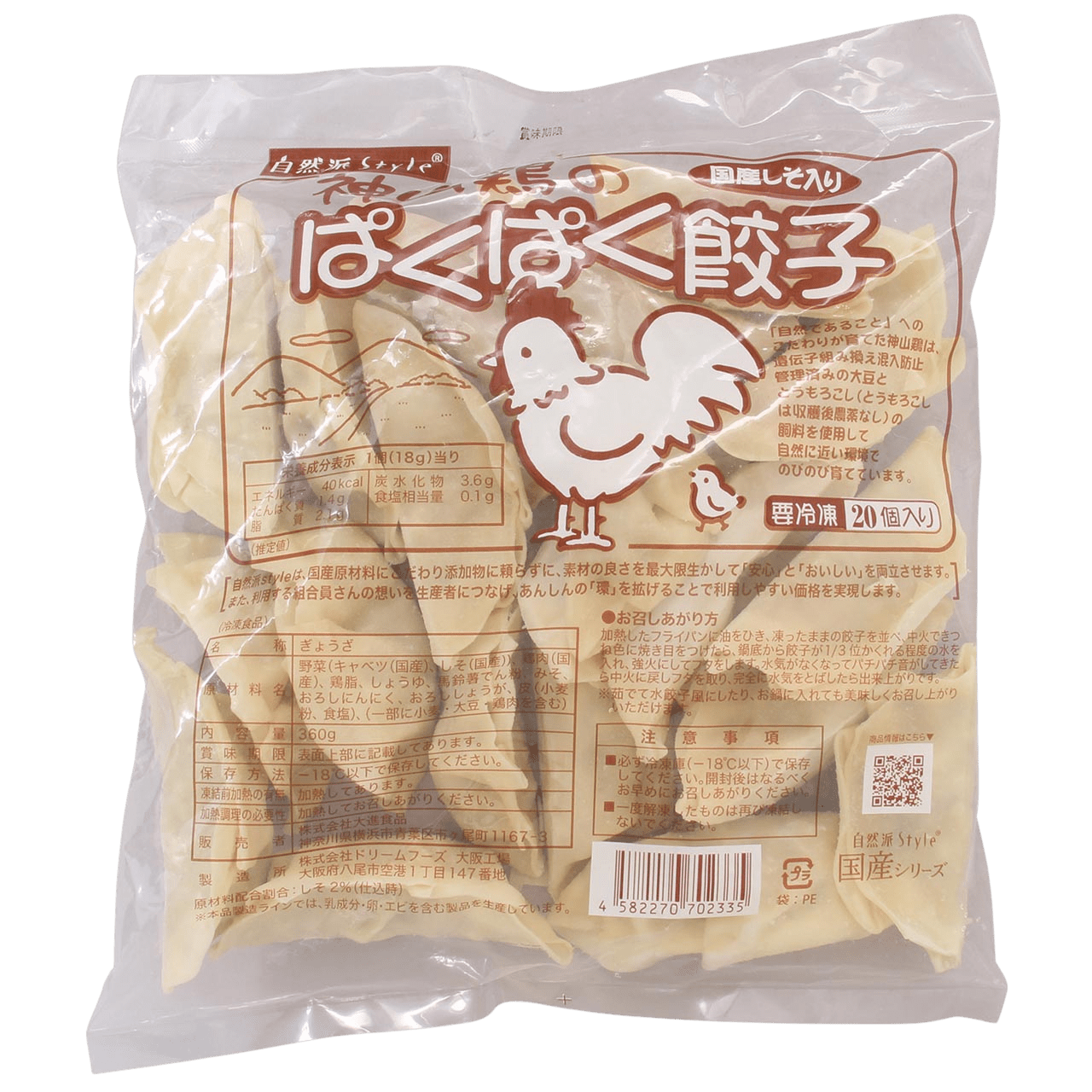 - 神山鶏の旨みが活きた、しその風味でさっぱり食べられる餃子です。